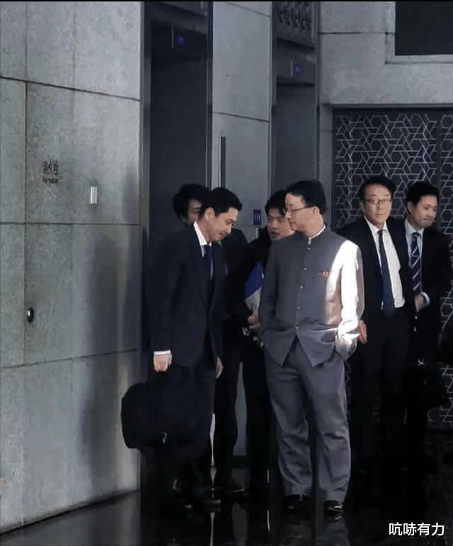 中国外交部亚洲司司长刘劲松穿着五四风中山装,胸前别着国徽,全程背手或双手插兜与日方交谈。