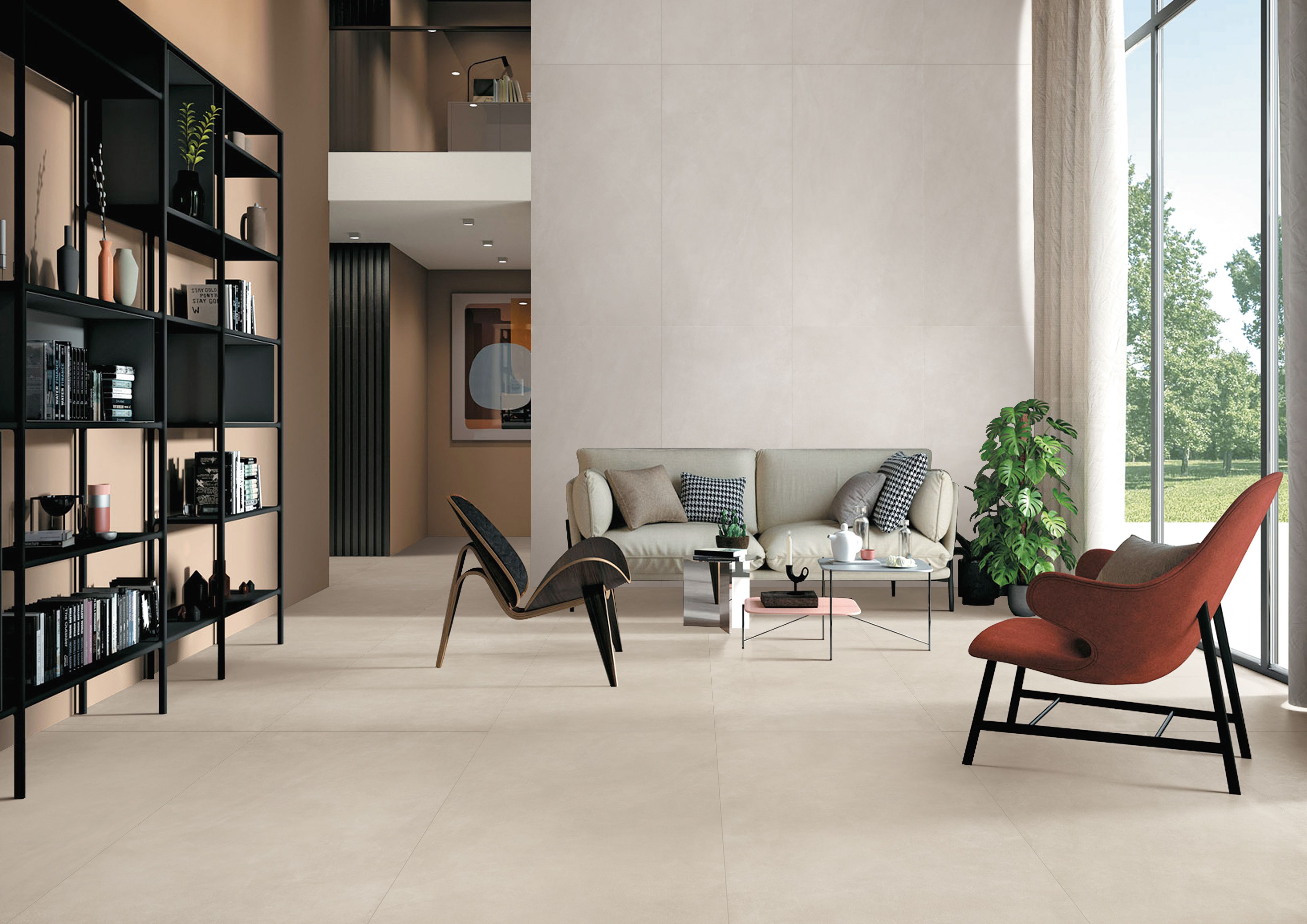 一、暖调侘寂风客厅:米杏色瓷砖的温柔包容 在暖调侘寂风客厅里,国际瓷砖品牌罗曼缔克芭莎蒂娜米杏色哑光瓷砖是空间的 “底色担当”。它的釉面带着细微的肌理感,像被岁月轻磨过的砂岩,没有过分的光泽,却在自然光与灯光下晕出柔和的暖调。