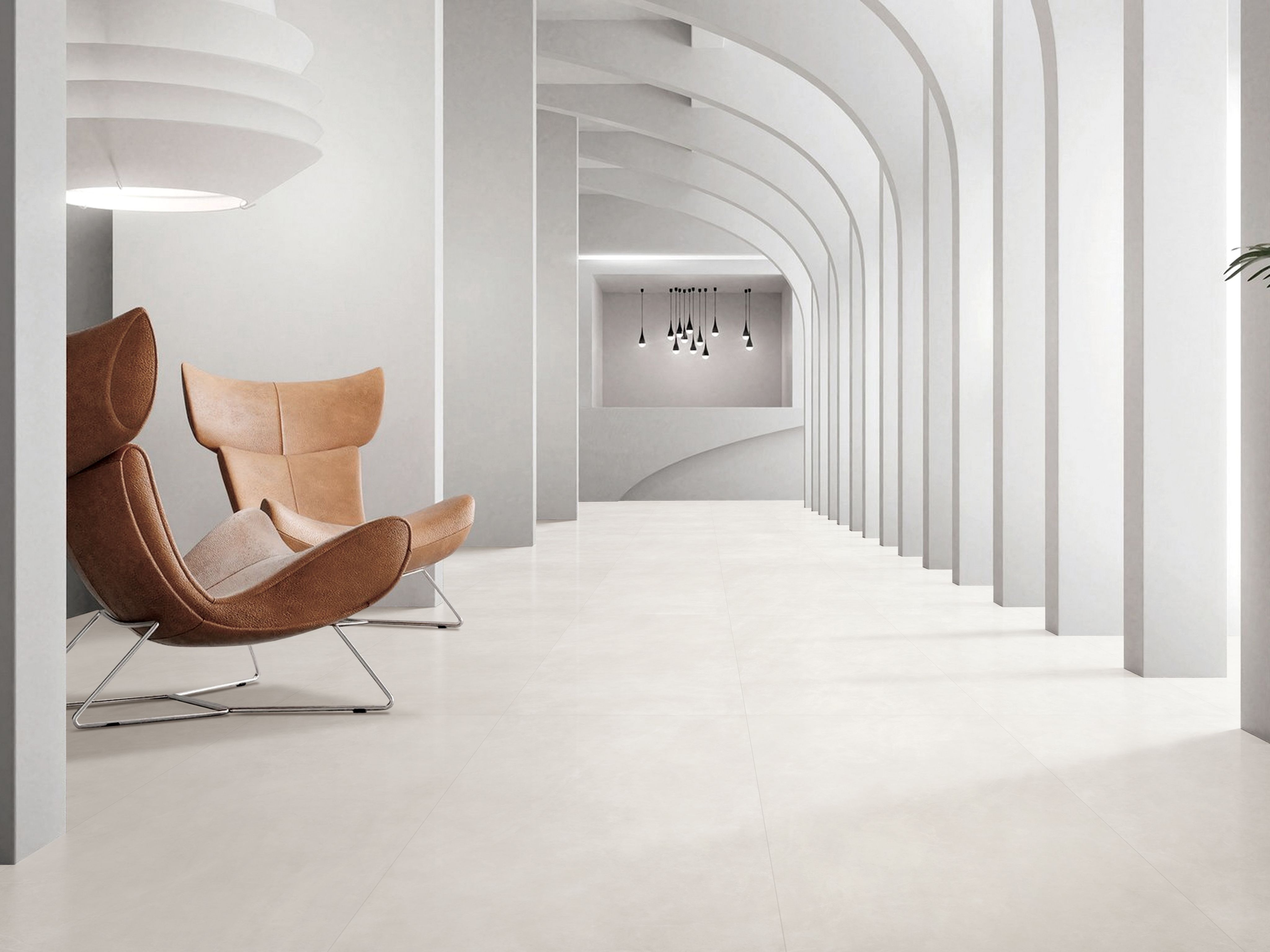 二、极简艺术走廊:浅灰瓷砖的高级留白 极简艺术走廊的设计,是国际瓷砖品牌罗曼缔克芭莎蒂娜浅灰瓷砖对 “高级感” 的另一种诠释。瓷砖的色调纯净如雾,表面的哑光处理让光线在这里变得柔和,弱化了空间的边界感,却强化了设计的艺术张力。