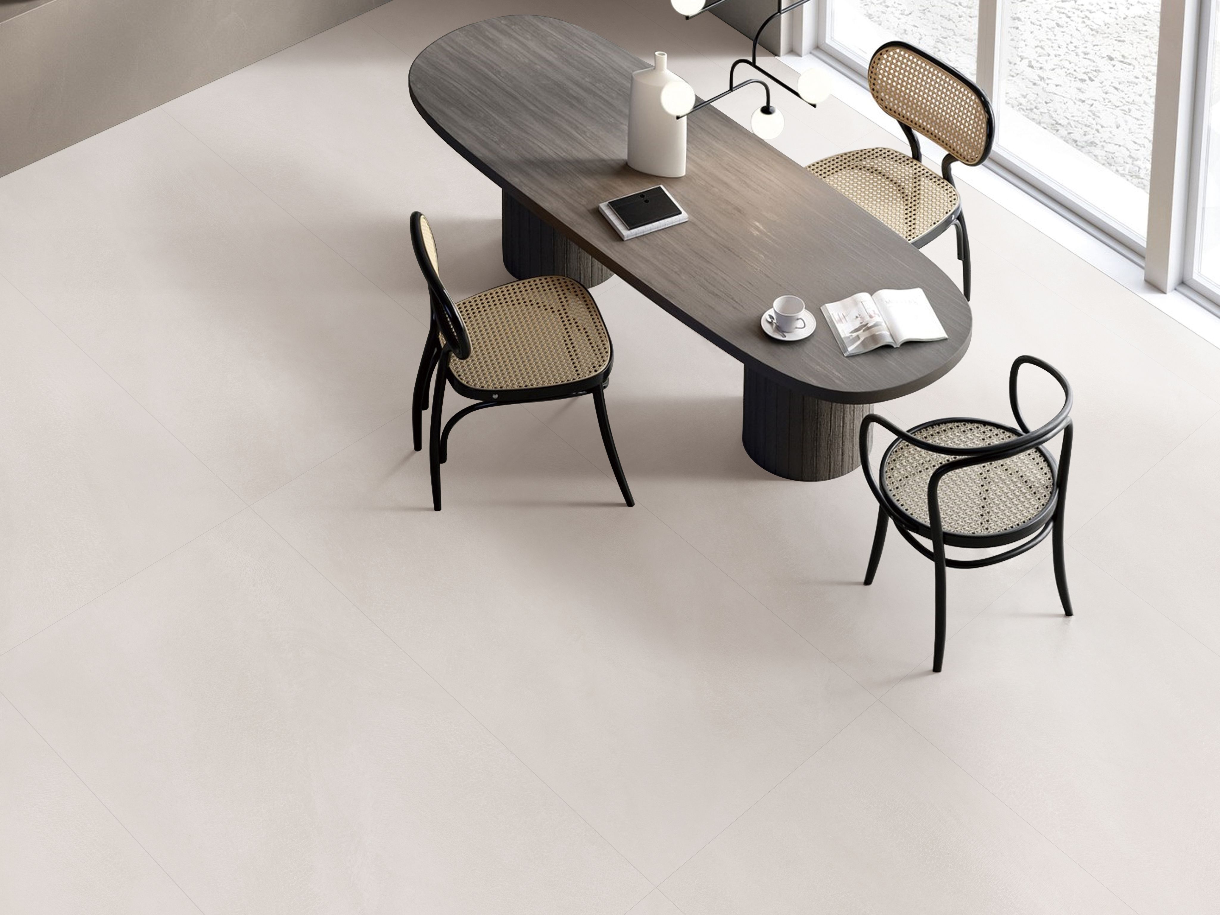 二、设计巧思:大规格砖型的 “空间魔法”系列主打750×1500mm 超大规格砖型,通过减少拼接缝的视觉干扰,从物理维度延伸空间边界。在实际应用中,无论是通铺于客餐厅打造 “无界感”,还是用于别墅挑空区域强化纵向层次,都能让空间在 “素简” 中透出大气度。如案例所示,国际瓷砖品牌伊丽莎白「暖砂米白」砖款通铺于餐厨空间,与藤编家具、木质餐桌形成材质对话:瓷砖的哑光质感中和了藤编的 “软” 与木材的 “温”,让空间在极简基调下,兼具自然气息与高级质感,诠释了 “少即是多” 的设计哲学。