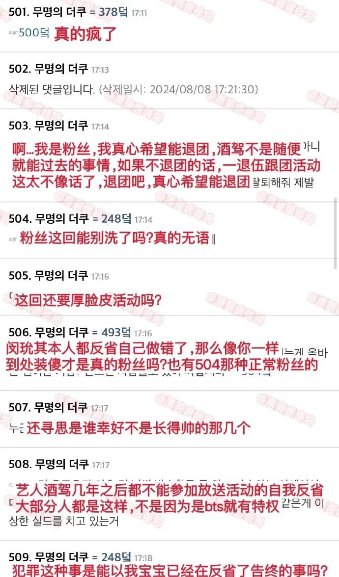 从粉丝的态度来看,对于这起事件引发了截然不同的反应。部分粉丝仍试图为偶像辩护,认为事件的影响并不大,并强调他的音乐才华和努力。而另一部分网友则对此不以为然,认为闵玧其不能因为自己的错误行为而逃避责任,直接要求他退团,认为这与他作为偶像的形象严重不符。他们的争论反映出如何处理偶像与粉丝之间关系的复杂性,这不仅是对偶像言行的期待,也是对发生问题后如何理智对待偶像的考验。