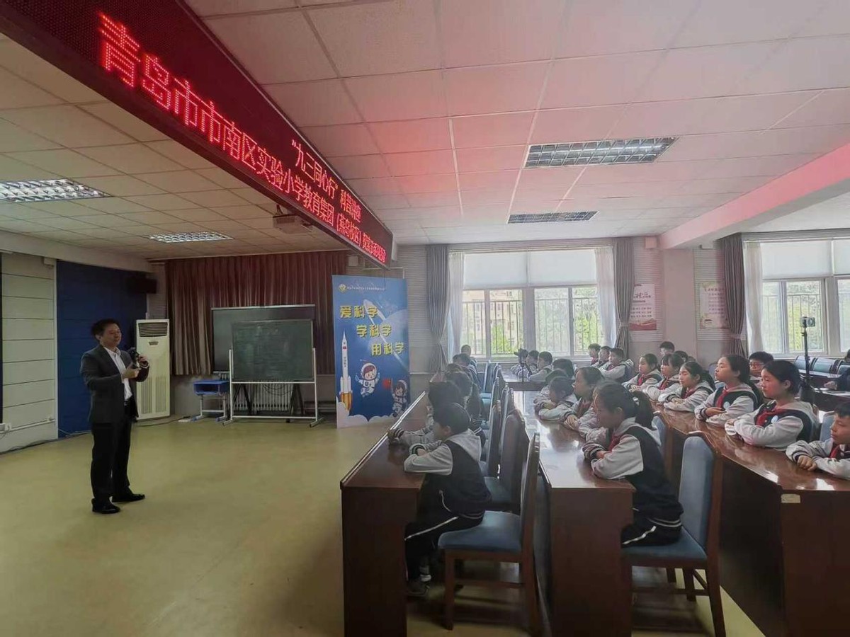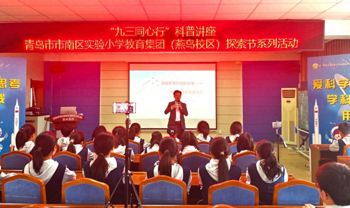 10月29日下午,九三学社青岛市市南区委员会紧扣市南区实验小学教育集团燕岛校区“探索节”主题,特邀社员、深耕国际时事与军事领域的博主刘海生,带来《祖国军事科技——黑科技武器装备简介》科普讲座。讲座面向五年级学生现场开讲,同时同步直播至全校各年级,近500名师生共同参与学习。