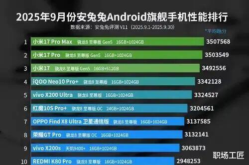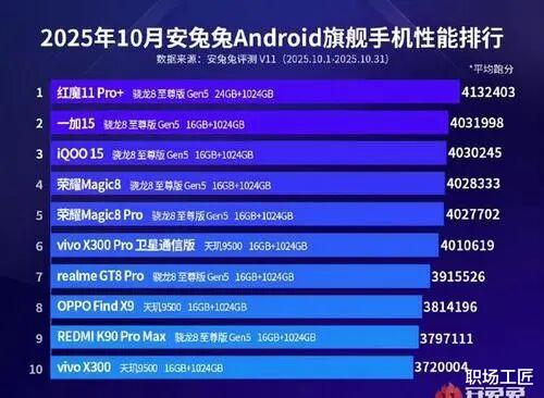 realme gt8 pro排名第七,OPPO Find X9排名第八,Redmi K90 Pro Max位居第九,vivo X300排在第十位。值得注意的是,vivo和OPPO各自有三款机型入选,荣耀两款,小米一款,中兴红魔一款。
