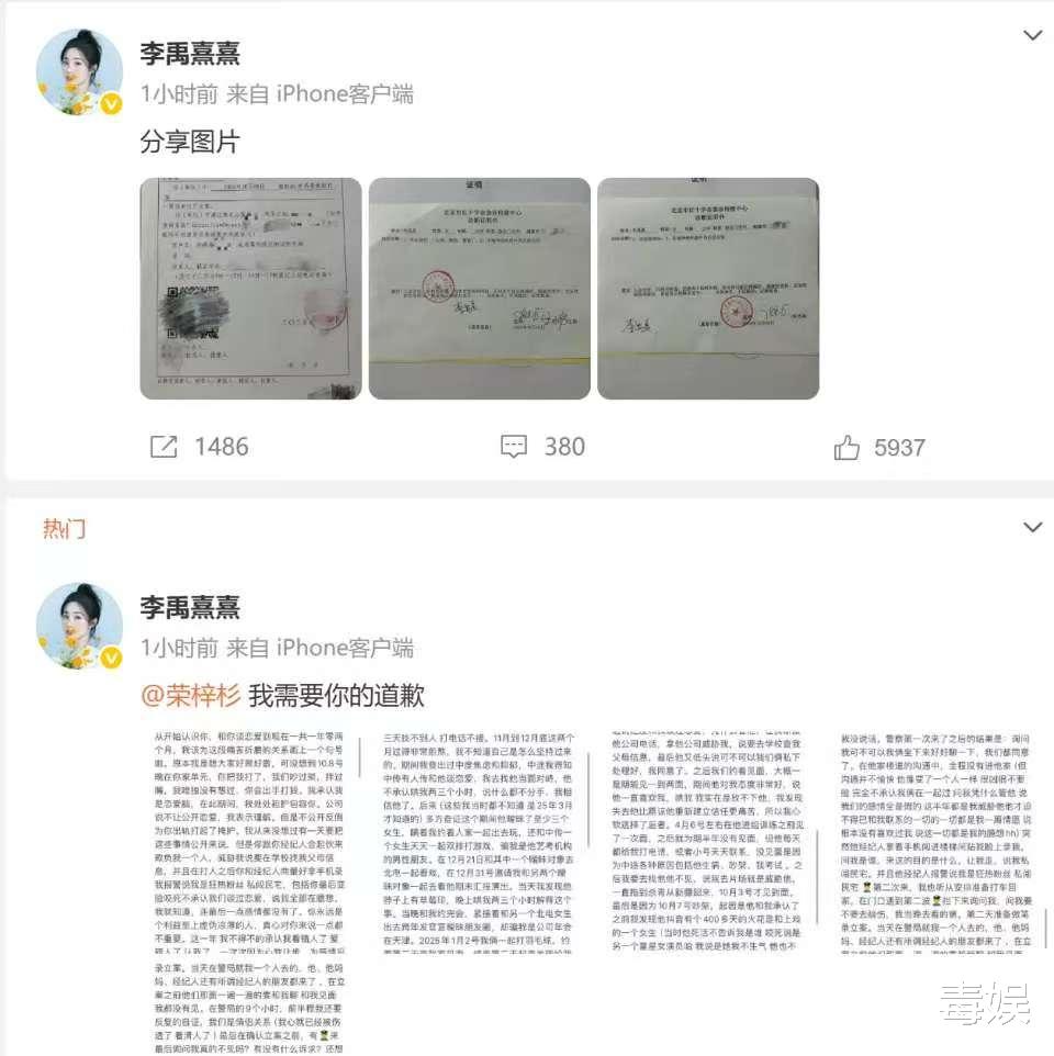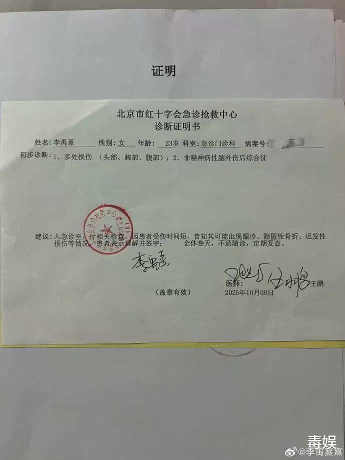 据她透露,两人交往一年多,从甜蜜到冷淡只用了三个月。期间,男方多次与他人暧昧,还被发现脖子上有“草莓印”。李禹熹熹表示,自己因精神压力太大被诊断出中度焦虑和抑郁。更令人震惊的是,她晒出的报案回执显示,两人冲突中荣梓杉疑似动手,将她摔倒在地,并恶语相向。