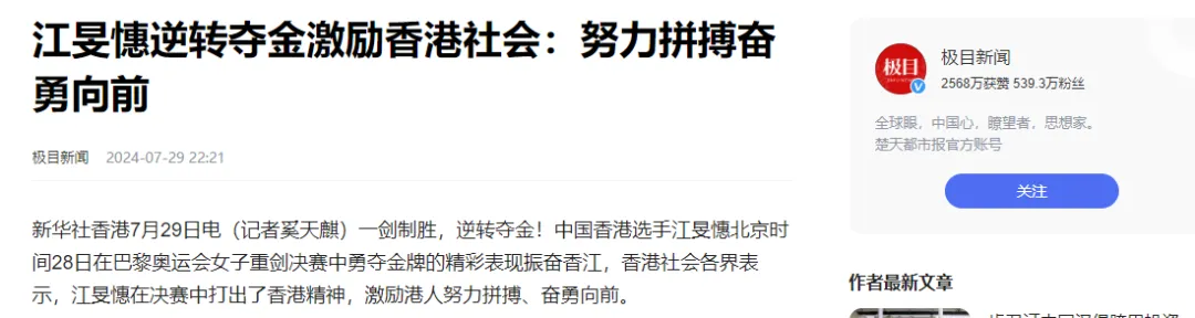 极目新闻2024-07-29——江旻憓逆转夺金激励香港社会:努力拼搏奋勇向前