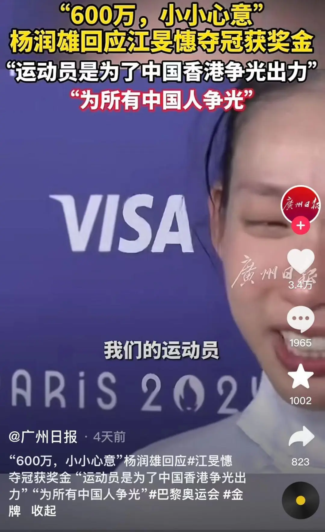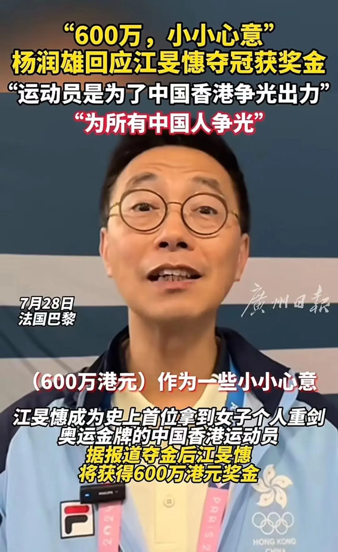 香港文旅局杨润雄还出面回应表示“这600万港元也是作为一些小小心意,因为运动员也是为了所有中国人争光”。