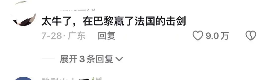 话说,这枚金牌的含金量是真的高,在巴黎赢了法国的击剑,网友们也都热烈祝贺。