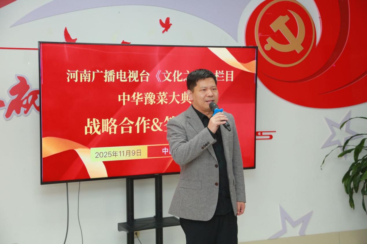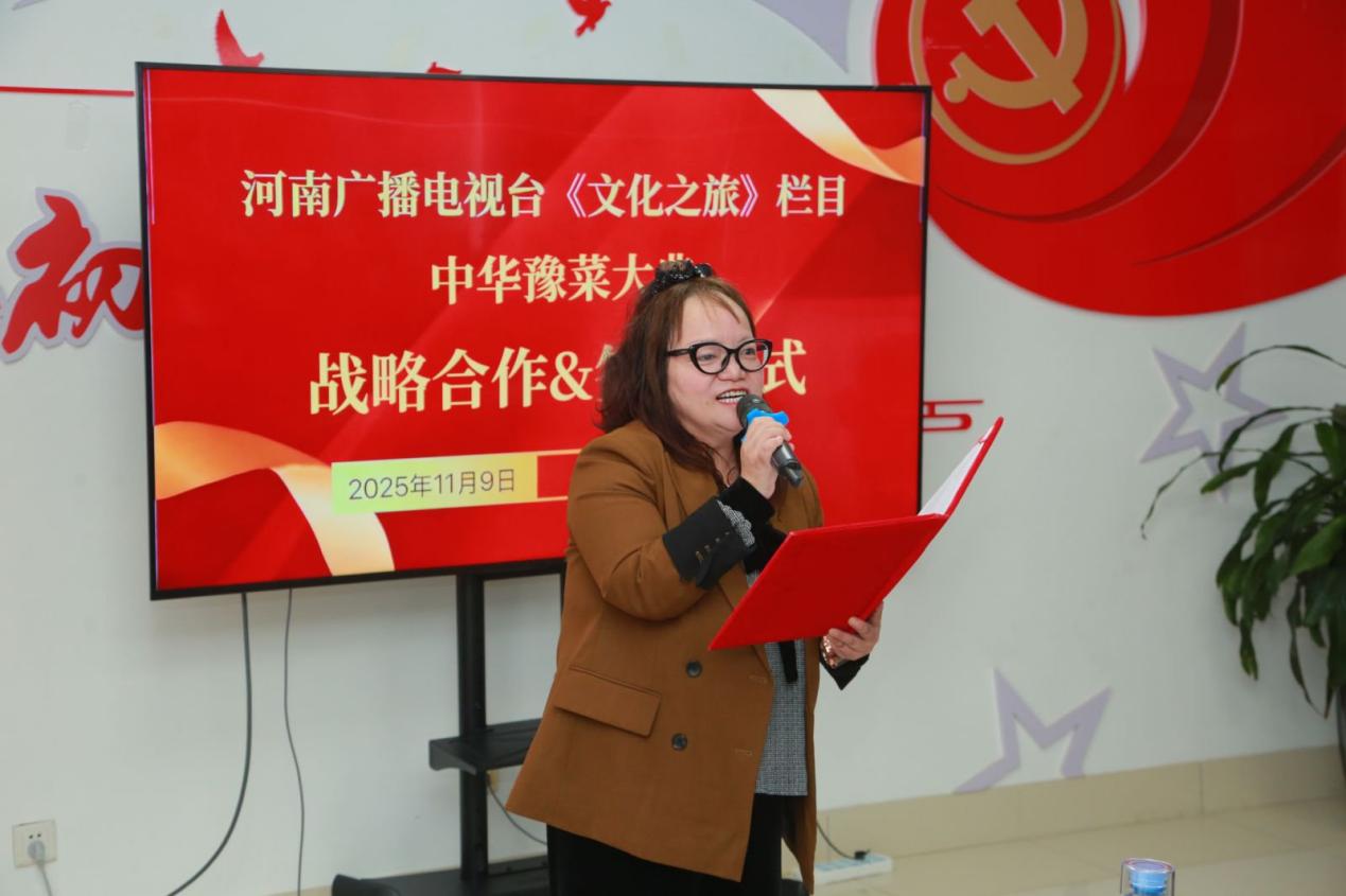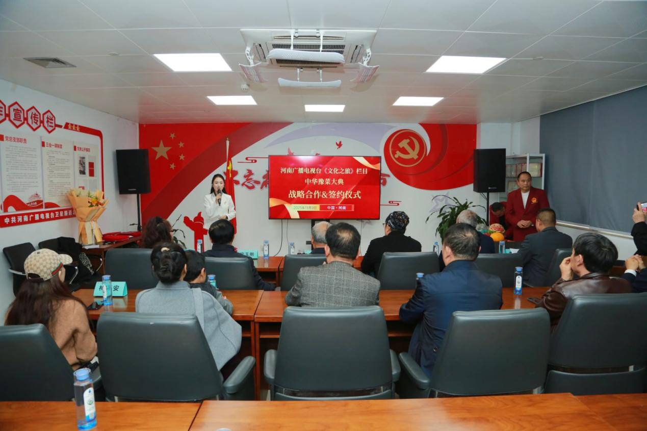 11月9日上午,河南广播电视台《文化之旅》栏目组与《中华豫菜大典》编辑部在8号演播厅正式签署战略合作协议。此次签约标志着两大文化 IP 将深度联动,以“媒体传播 + 典籍传承”的创新模式,系统性挖掘豫菜背后的历史文脉与工匠精神,为这一河南非物质文化遗产注入当代传播活力。来自餐饮界、文化界、书画家、中医界、退休老领导以及栏目组综合部、运营中心、文旅部、公益部、顾问团队的负责人共同出席此次盛会。活动由栏目主持人王冰玉主持。