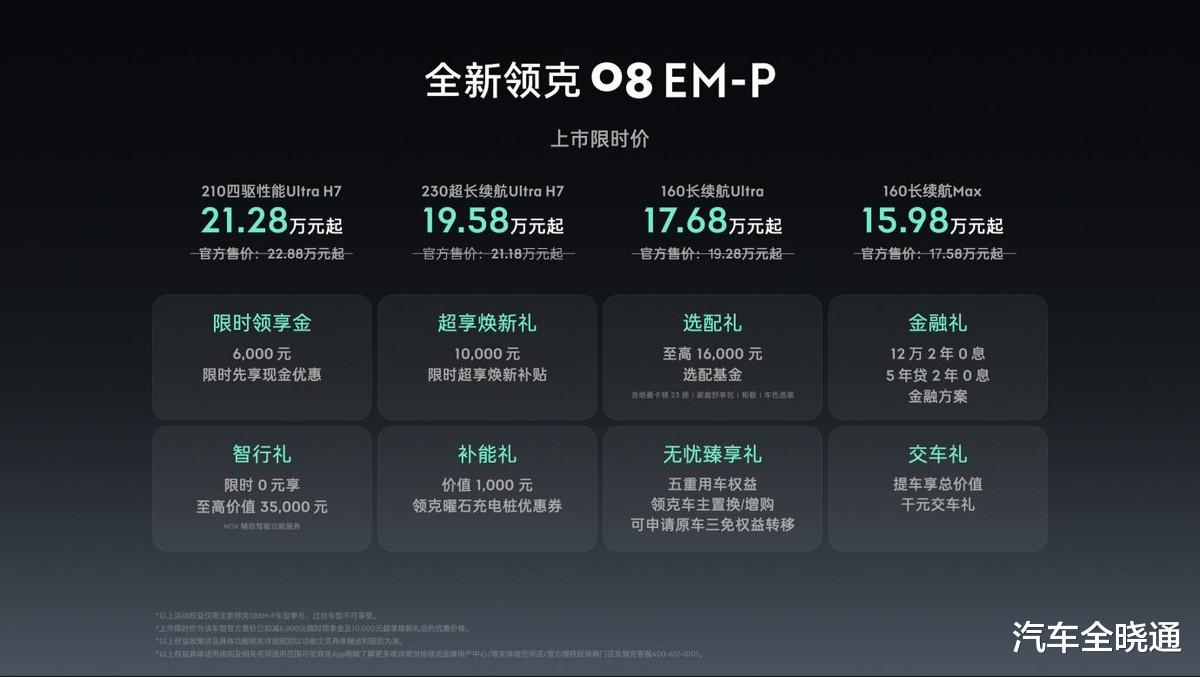 【2025年9月24日 上海】今日,“家庭豪华智混SUV”全新领克08 EM-P正式上市。新车提供160长续航Max、160长续航Ultra、230超长续航Ultra H7、210四驱性能Ultra H7四款车型可选,官方限时价15.98万元-21.28万元。同时,伴随新车上市还有限时领享金、超享焕新礼、选配礼、金融礼、智行礼、补能礼、无忧臻享礼、交车礼在内的8重限时福利。