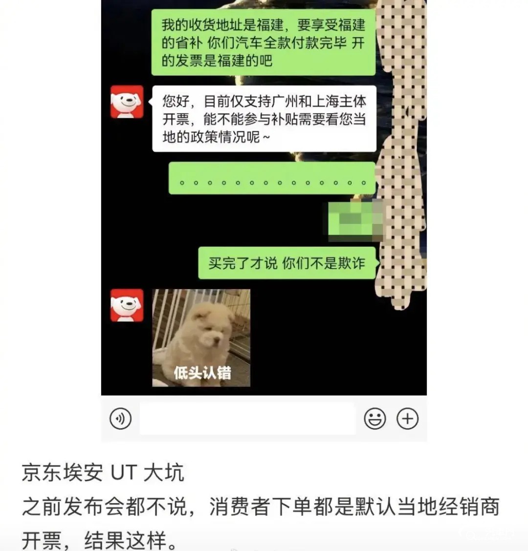 此外,发票开具受限也是劝退很多消费者的原因之一。京东称新车只能开具上海和广州两地发票,这就导致外地消费者即使成功申请到所在地的地方补贴,由于开票地不一致则无法享受补贴。