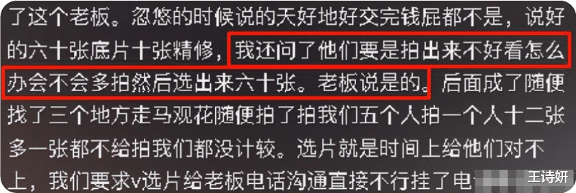 原本口头答应1500套餐包含60底片,10张精修照片,结果只是每个人随便拍了12张,一行五人合起来60张,匆忙拍完急着叫王女士回店选片。