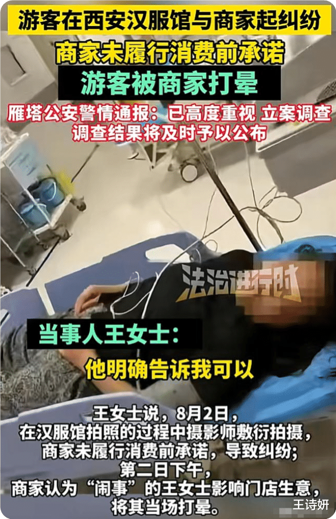 这时候老板一看生意黄了,就上手往王女士脑门打了一拳,后来王女士被接到医院治疗,汉服店老板也被民警带走。