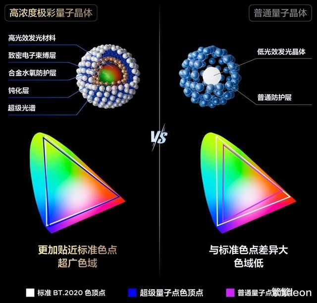 超级量子点:材料学的突破。TCL深耕量子点领域十余年,此次应用的超级量子点可以视为量子点材料的最新迭代技术。其核心在于采用了“高浓度极彩量子晶体”结构。这种结构带来了更高的量子效率(光转换效率更高,更节能)、更窄的半波宽(发出的色彩色纯度更高)以及更强的抗老化特性。它为全局高色域提供了源头上的“优质颜料”。