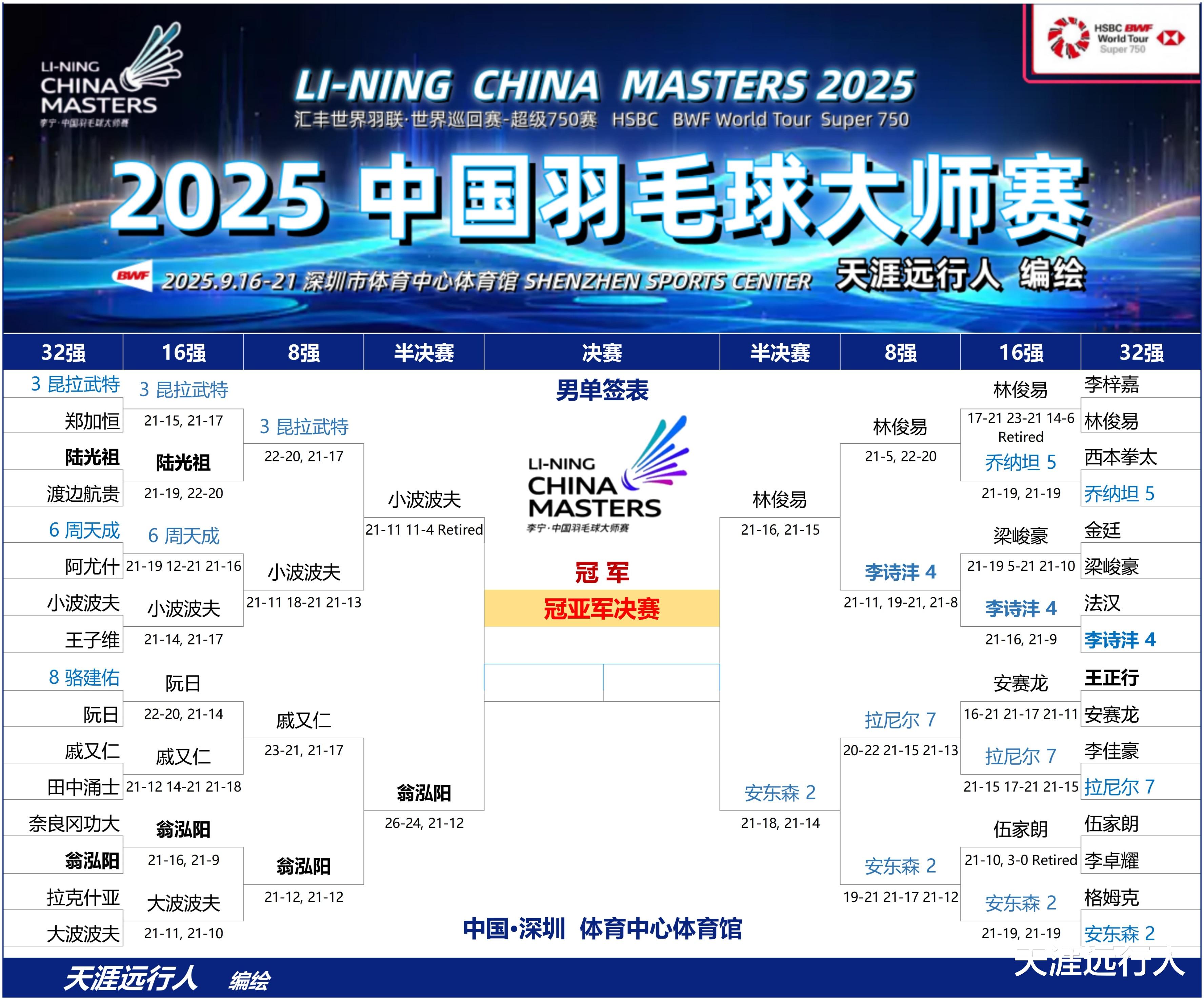 北京时间9月19日21时49分,2025世界羽联超级750中国大师赛8进4轮次的19场角逐,全部决出了胜负,男单昆拉武特本轮中途退赛,法国小波波夫坐收退赛礼,轻松跻身四强。
