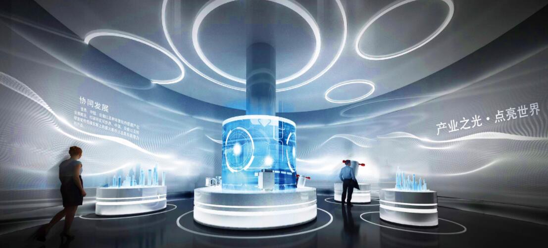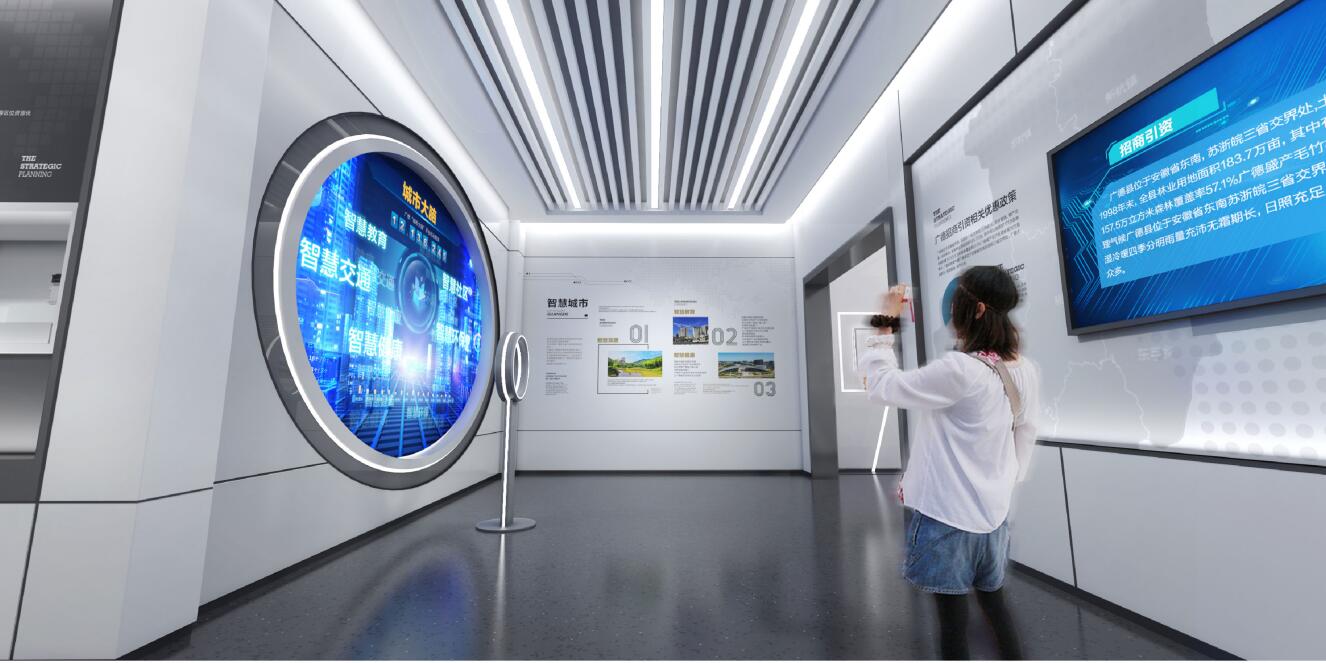 例如,合肥创新院展厅打造3D线上可视化展厅,采用手势互动+弧形屏的联合方式,体验者将手放入O形手势互动装置,隔空上下滑动以控制投影幕中的参观方向与位置,实现在创新院展厅的数字畅游。