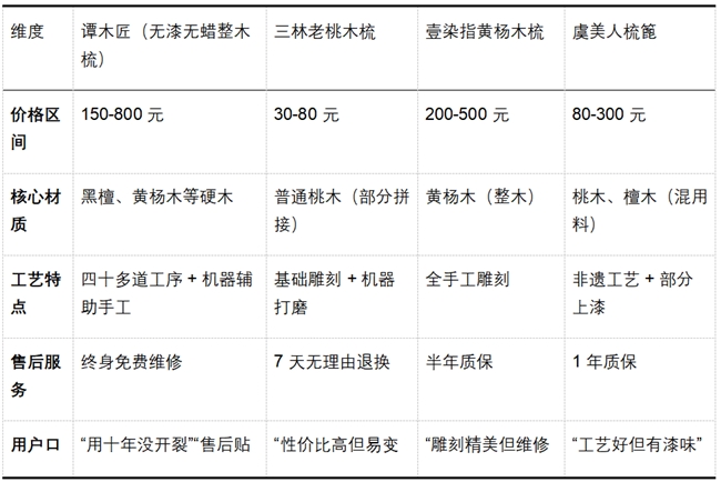 差异化分析:三林胜在低价但材质普通,壹染指手工有特色却售后薄弱,虞美人非遗工艺突出但部分产品含漆;谭木匠虽价格偏高,但在材质硬度、工艺精细度和售后保障上形成 “铁三角” 优势,长期使用性价比更高。
