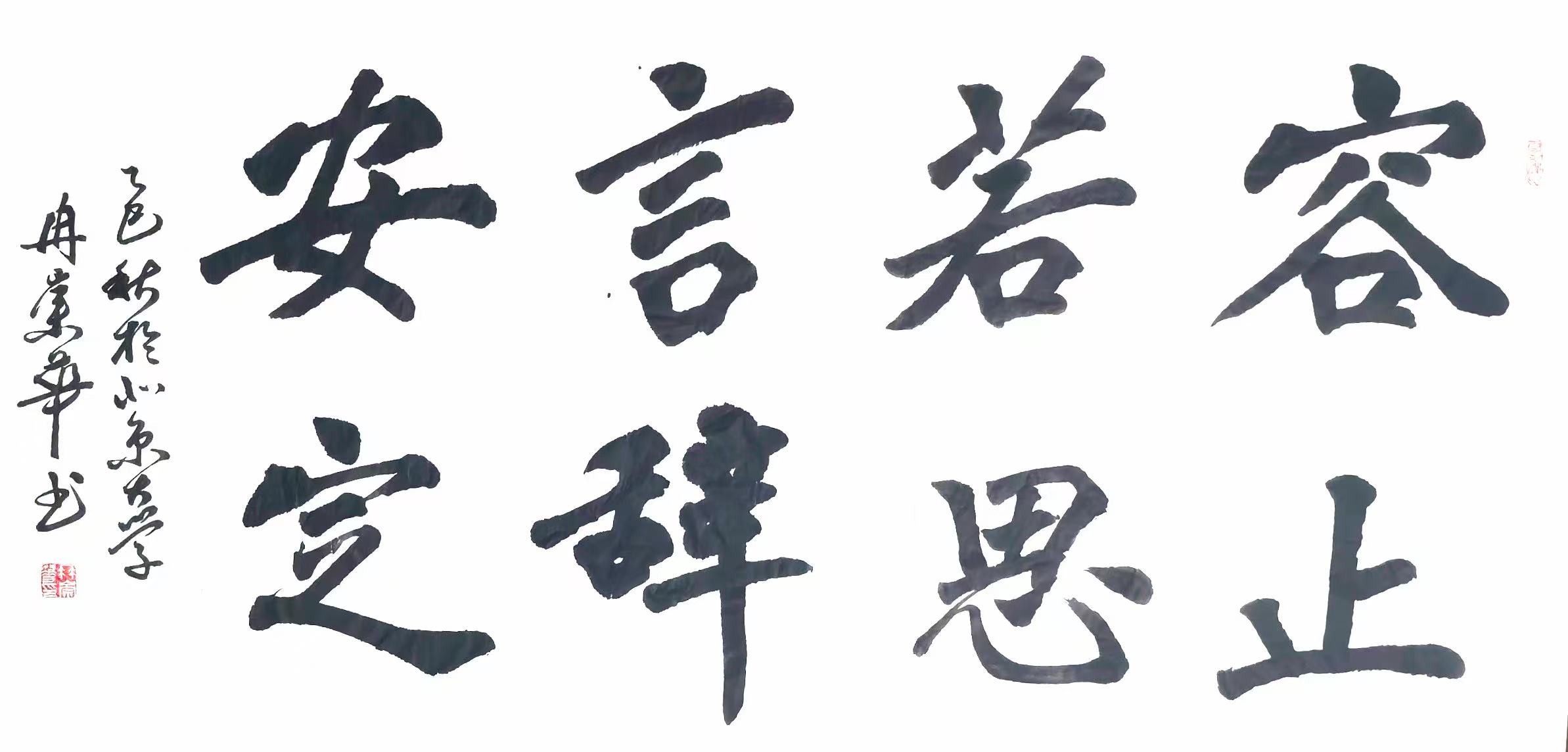 冉崇华擅长八分书、行书、楷书等多种书体,并能将不同书体的特性融入同一作品。在《忆江南·连队周日聚餐》中,他以行书书写主体内容,通过流畅的笔势展现战士间的质朴情感;而在落款处采用楷书,以工整的字体强化作品的仪式感。这种“主次分明、刚柔并济”的创作手法,被中央美术学院教授称为“突破单一书体局限的创新实践”。