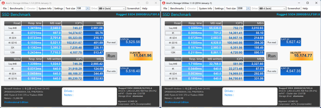 Anvil's Storage Utilities下的性能表现包含了顺序读写、4队列随机访问、16队列随机访问以及4K随机访问等多种基准测试,不仅能够精确测量各项操作延迟,还能依据测试结果生成综合评分,确保了测试内容的深度与广度的均衡性,具有较高的参考价值。雷孜Rugged SSD4在1GB和32GB模式下均得到了超过10000的得分,表现不错。