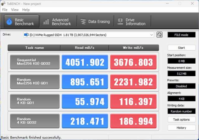 从TxBENCH测试结果来看,雷孜Rugged SSD4的成绩与CrystalDiskMark的传输速度差距不大,顺序读取速度可以达到4051MB/s,顺序写入速度可以达到3676.8MB/s。