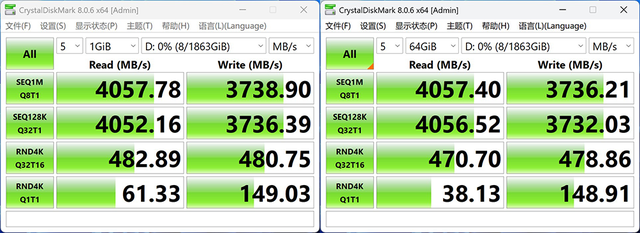 在以1GiB为标准的CrystalDiskMark性能测试中,雷孜Rugged SSD4达成了4057.78MB/s的连续读取速度以及3738.90MB/s的连续写入速度,此实际表现超出了其官方标称的数据传输速率阈值。在64GiB的测试条件下,雷孜Rugged SSD4展现出稳定的性能——其连续读写速度数据与此前在1GB容量测试中所获结果几乎无显著差异。这表明该SSD在不同容量负载下均能够维持一致的高效读写能力。