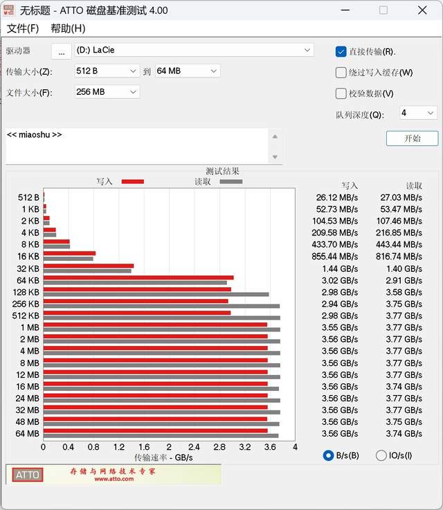 从ATTO Disk Benchmarks结果来看,512KB下的读取速度可以达到3.75GB/s,读取速度为2.94GB/s,读取速度几乎拉满。从1MB开始,写入速度能稳定3.55GB/s左右,读取速度也能稳定到3.7GB/s。