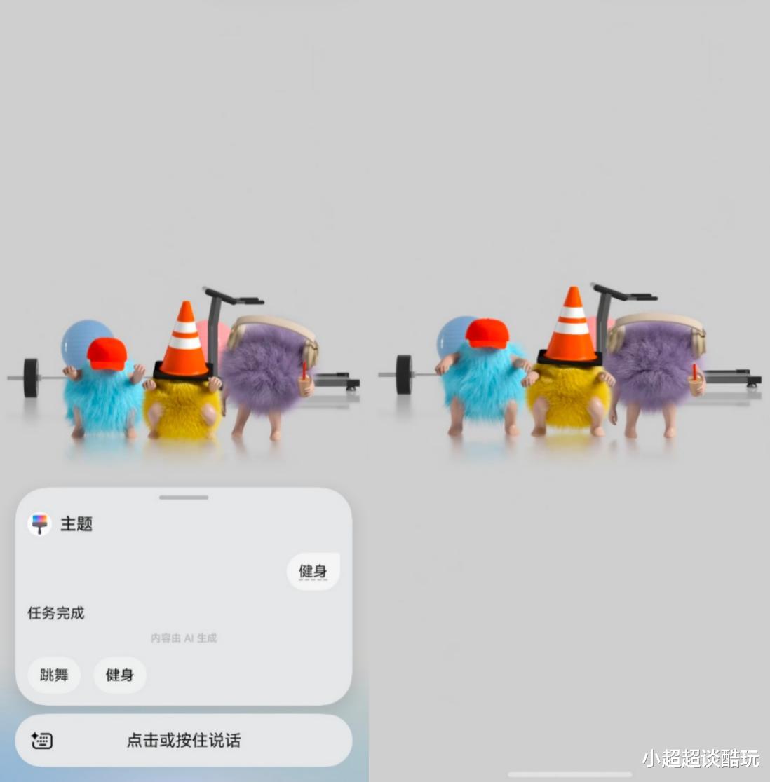 这款主题也是我日常上班时的精神摸鱼搭档。下午犯困时,点开锁屏界面的小艺图标,直接吩咐它“健身”。这几个毛球就会做各种健身动作。看着它们在努力营业,而我在这边带薪摸鱼,有种奇妙的反差萌,是只属于我的解压方式。