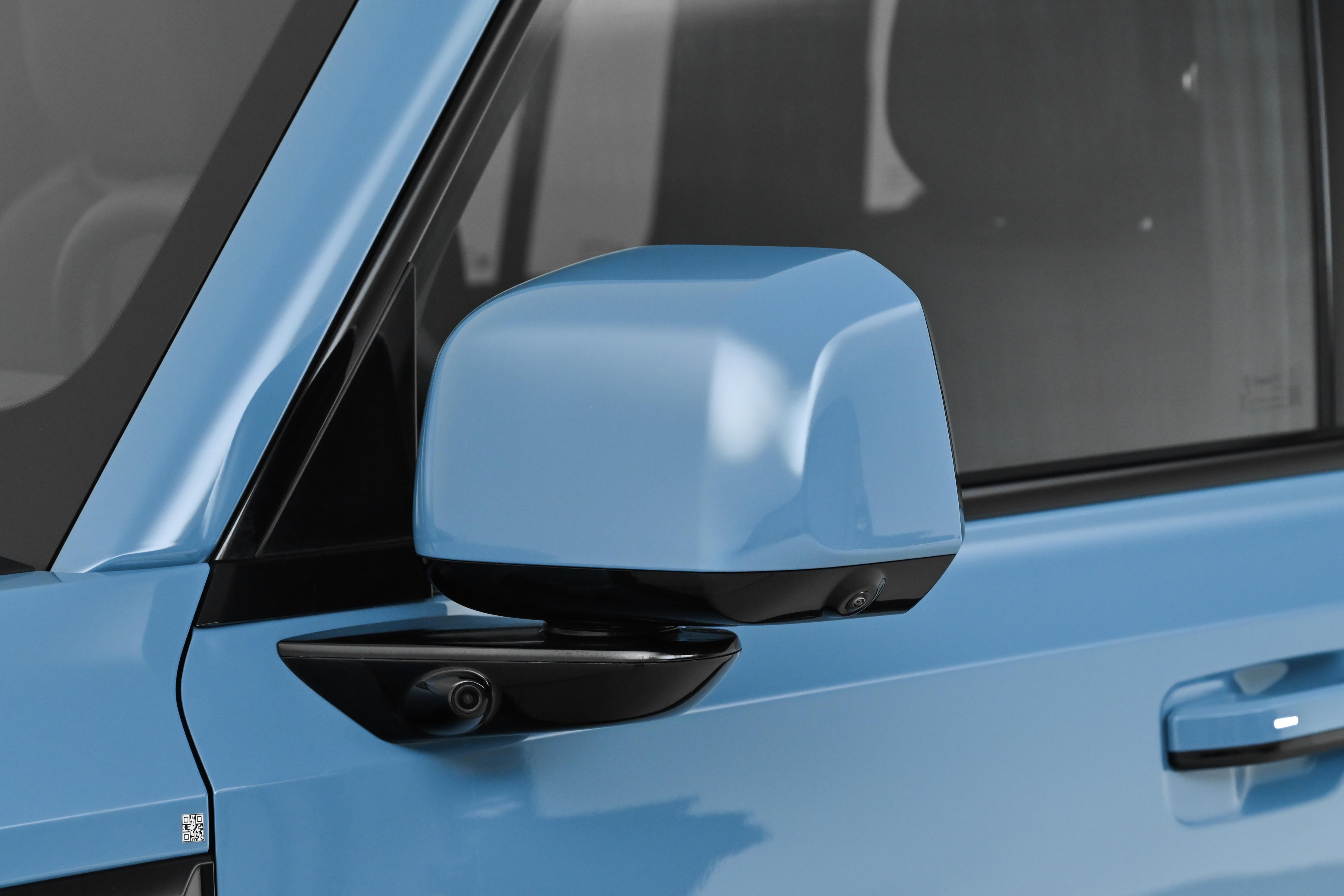 车身侧面为经典方盒子造型,直立A柱搭配平直硬朗腰线,宽高比接近1.1,视觉稳重大气,也为车内空间奠定基础。车顶行李架设计实用,无需后期加装,可直接放置露营装备,为户外出行提供便利。外扩黑色轮眉搭配银刃轮毂,加上固定脚踏板,既提升通过性,也让侧面造型更具层次感。翼子板处的“科技岛”设计贴心,集成NFC功能与摄像头,刷卡解锁便捷,盲区辅助功能也能提升行驶安全性,细节尽显考量。