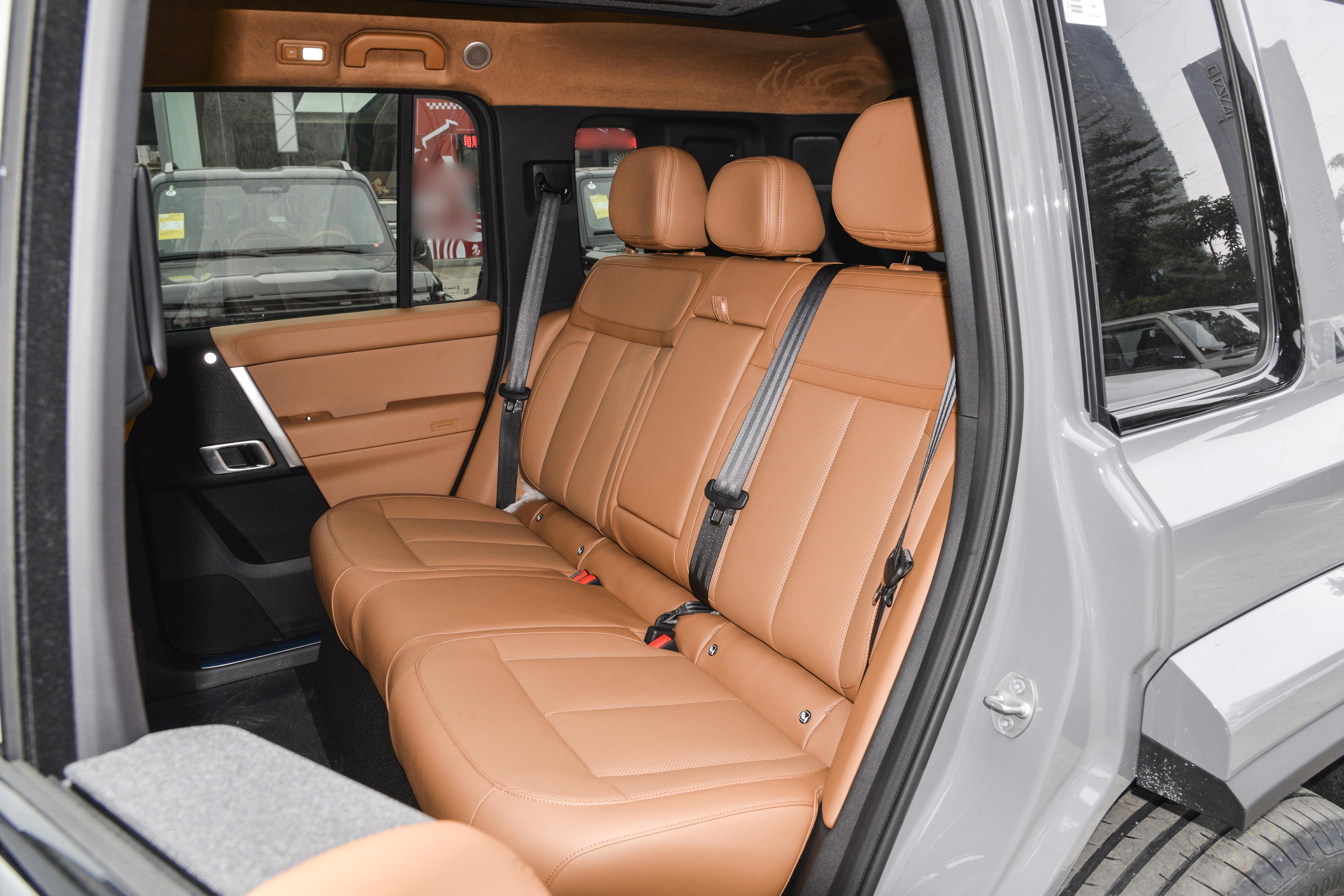 车尾延续整体硬朗风格,线条平直利落,采用侧开式尾门与外挂式全尺寸备胎,进一步强化越野气质。乐高式尾灯造型新颖,点亮后辨识度极高,夜间也能轻松识别。该车车身长宽高分别为5055/1976/1894mm,轴距达2910mm,宽大尺寸不仅让造型更大气,也为车内空间提供了坚实保障,金黄色车身与硬朗造型行驶在路上,总能收获不少目光。