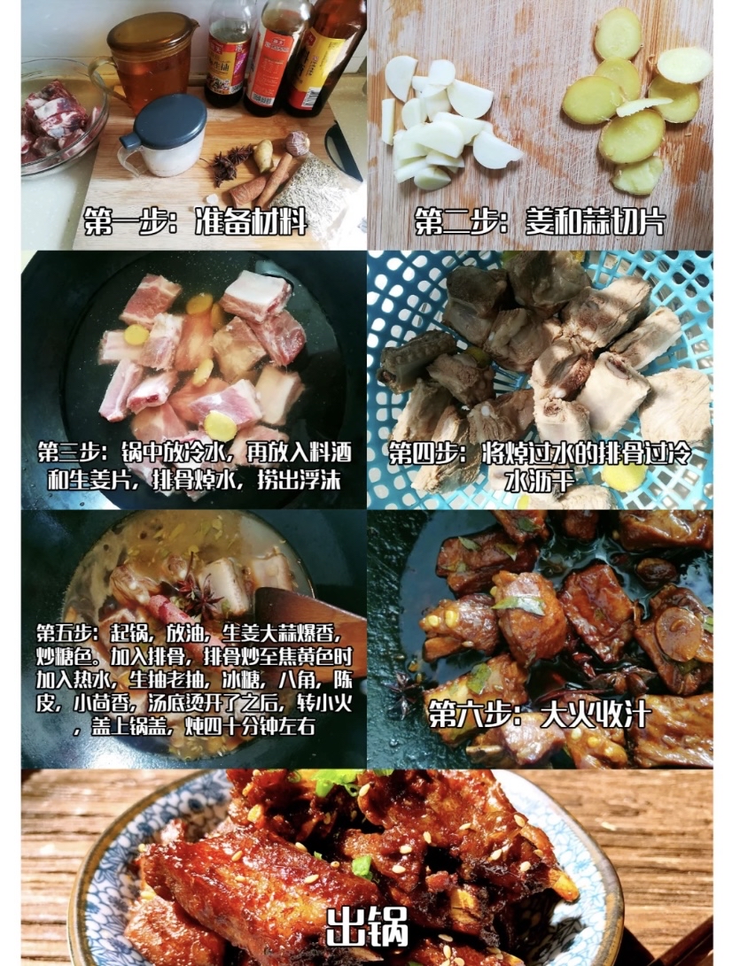 首先,把排骨切成小段,准备姜和蒜切片。锅中放冷水,用料酒、姜片焯水,去腥味。然后,热锅凉油,把排骨煎到两面金黄,再加入生抽、八角、冰糖、陈皮等材料和适量的水,用大火烧开,然后转小火,慢慢炖煮,直到排骨变得烂软入味。
