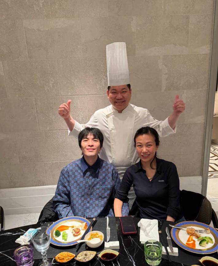 照片中,萧敬腾和妻子林有慧邀请星级厨师上门,在家中享用了一顿精致的铁板烧大餐。