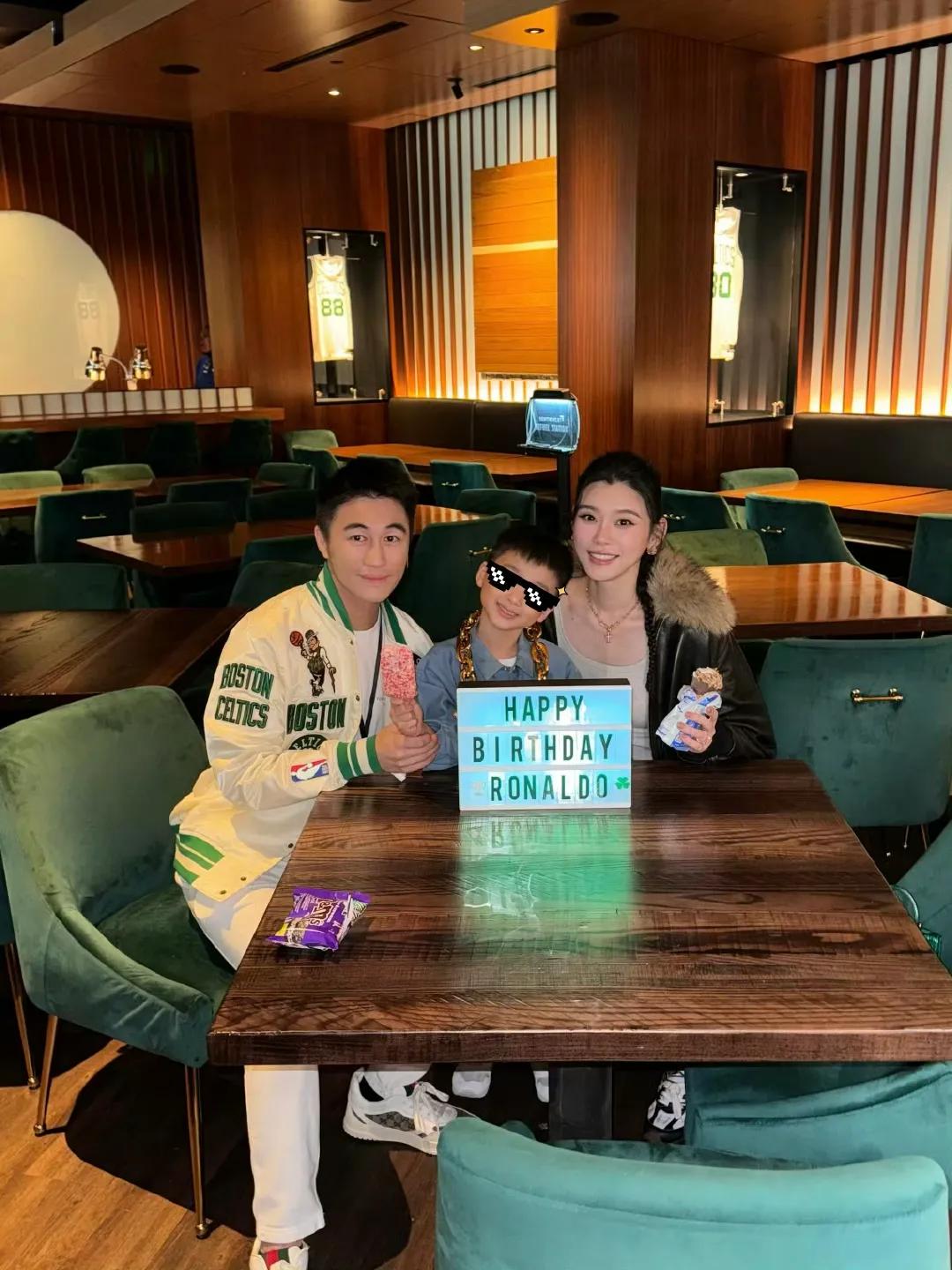 照片中,奚梦瑶身穿黑色皮衣,搭配短裤,一身时髦打扮酷范十足。何猷君身穿白色棒球外套和白色裤子,运动风打扮帅气有型。儿子何广燊身穿黑色衬衫,挂着“大金链子”,打扮帅气可爱。一家三口去餐厅庆祝生日好欢乐,奚梦瑶和儿子拿着冰淇淋,笑容满面,看起来好幸福。