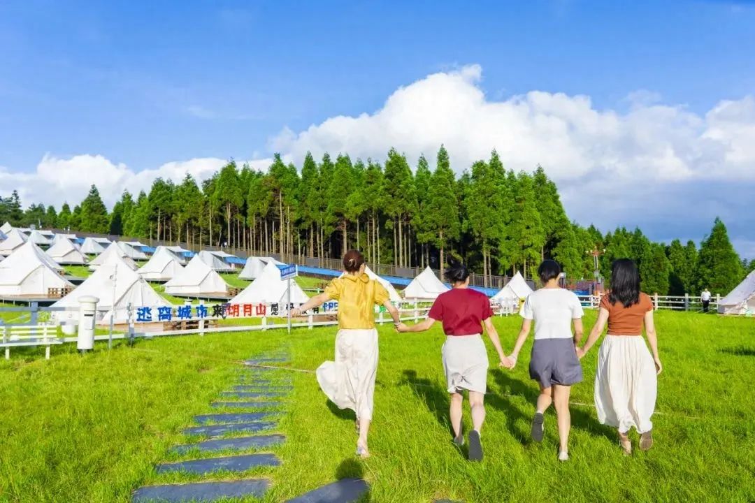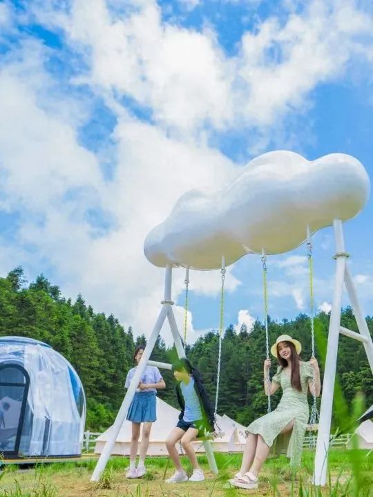 乘坐观光车返回明月山轻奢露营地,在超级出片的露营地打卡点拍照,欣赏蓝天白云草地的美景。