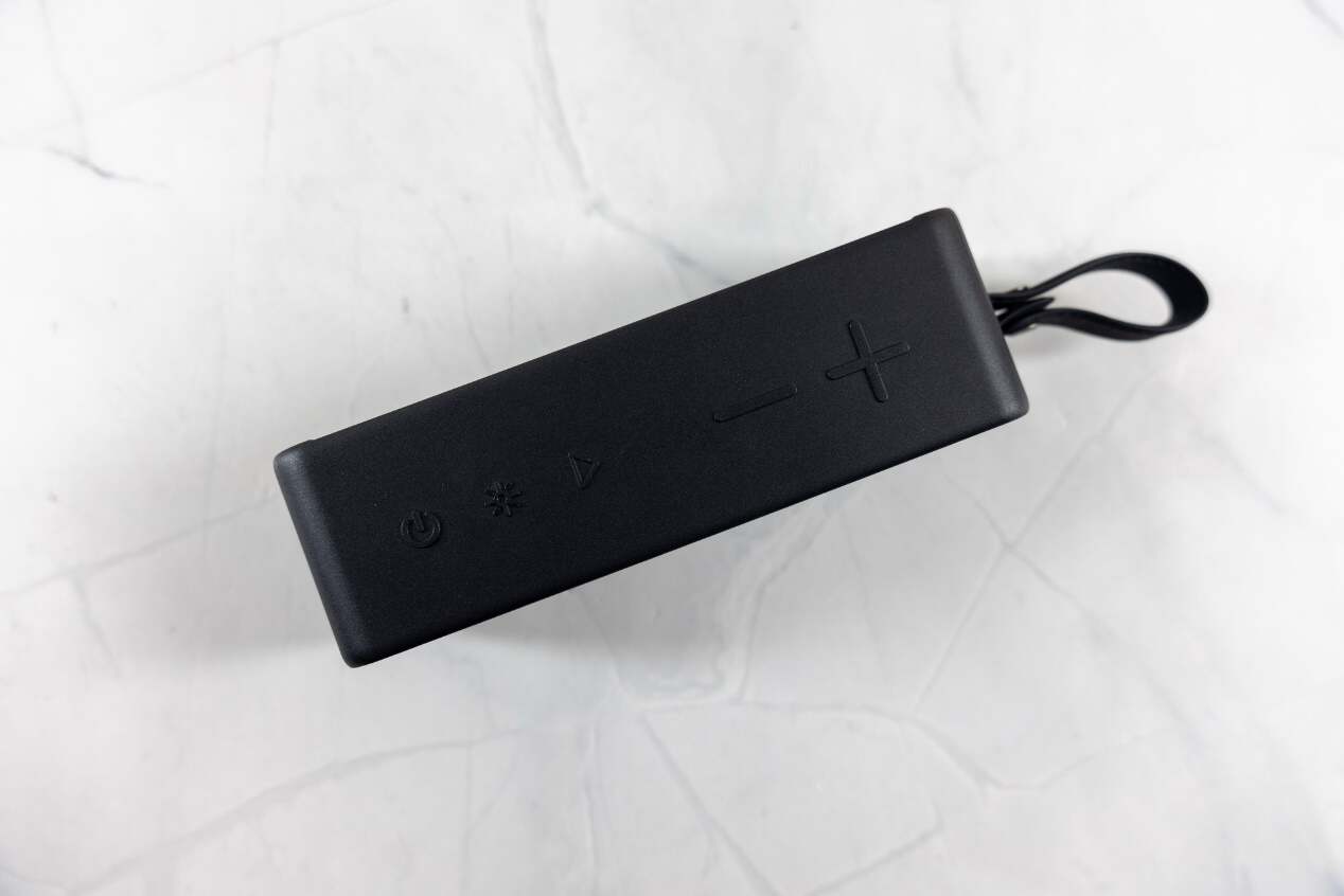 音箱左侧则是各种接口的所在,这里还配备了防尘塞,这里的接口有USB,Type-C充电口和AUX音频输入接口。有点遗憾的是没有直接设计一个TF卡槽,虽然通过USB也可以接读卡器来播放TF卡,甚至可以直接用U盘来播放音乐,但是这样无疑都会使得防尘塞打开,而如果有TF卡槽,TF卡插入后防尘塞就能正常关闭,防水防尘性能会更好。