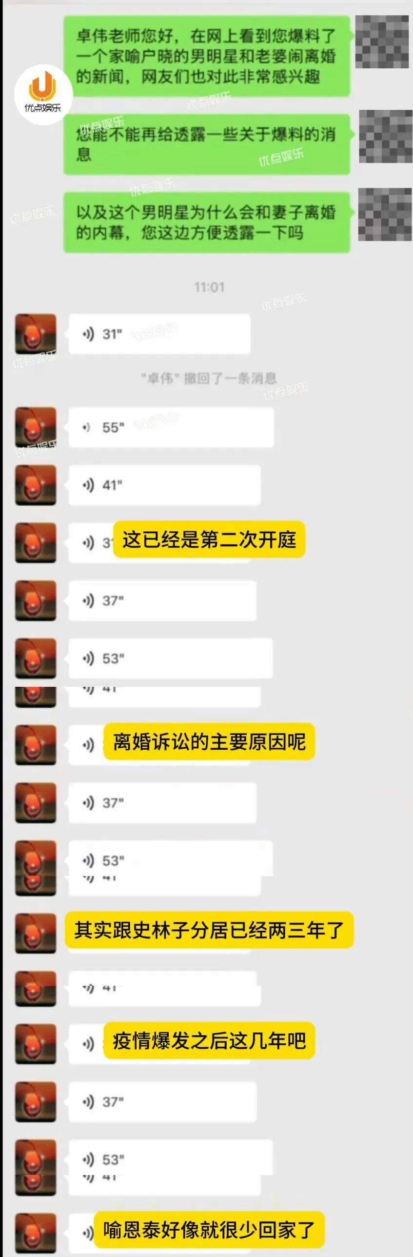 据卓伟爆料,喻恩泰与史林子已分居两至三年,疫情期间聚少离多,矛盾彻底激化。