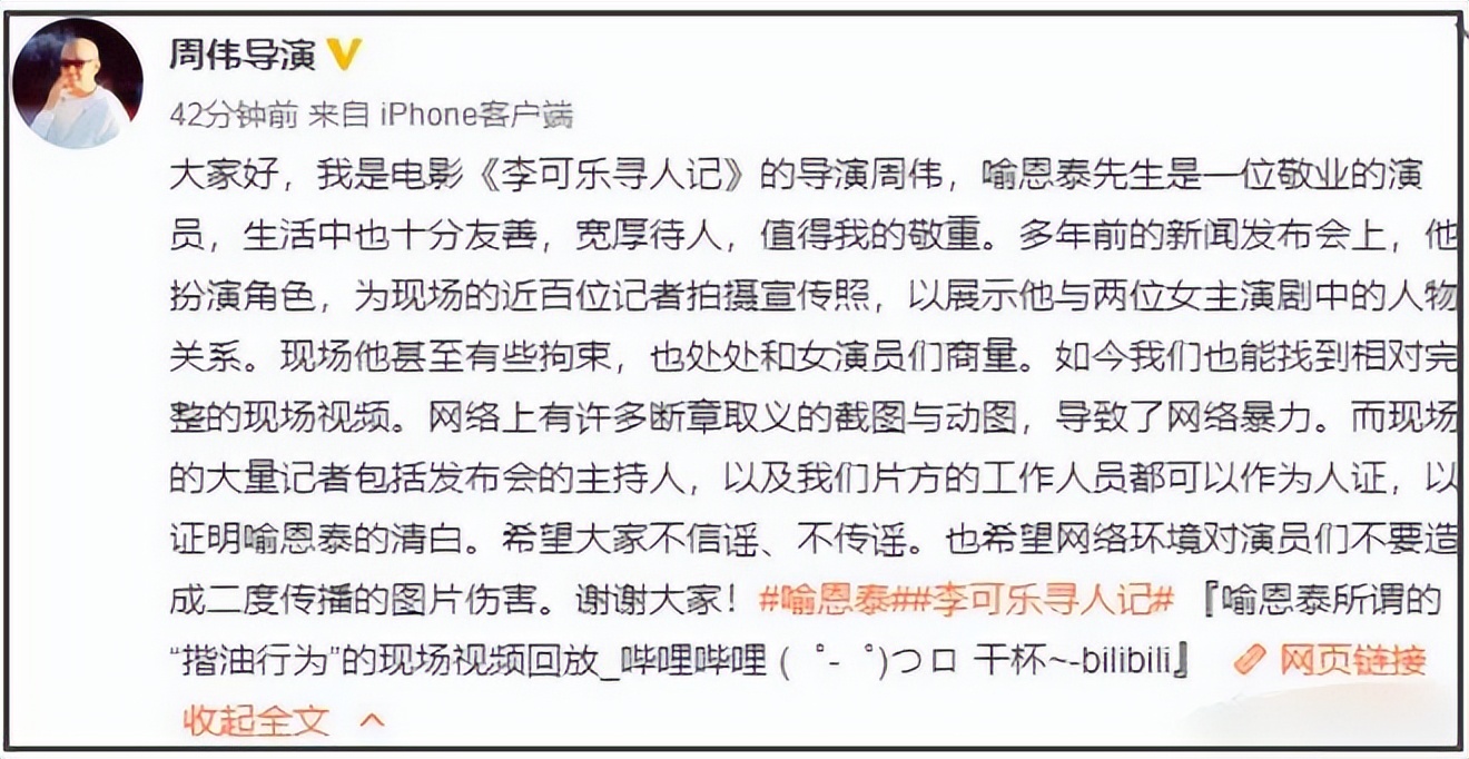 之后王澜霏发文内涵,不过导演却力挺喻恩泰,称赞其敬业。