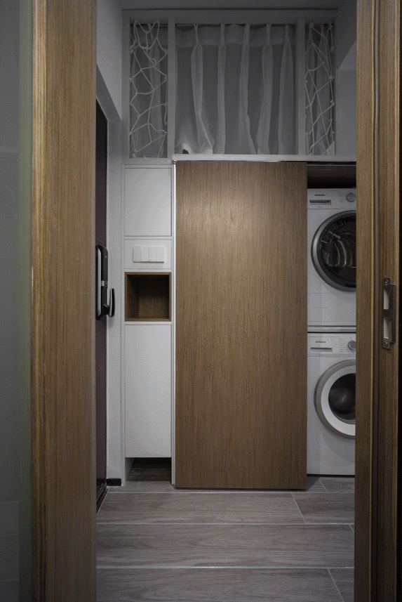烘干机解决衣物晾晒,解放阳台,并设在临近衣帽间处,烘干后的衣服可直接放置在开放式短挂衣区台面上进行叠衣,且高度设计合理。