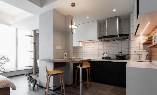 利用立柱一侧作为支撑,设计折叠型简易餐桌,将餐厨一体化