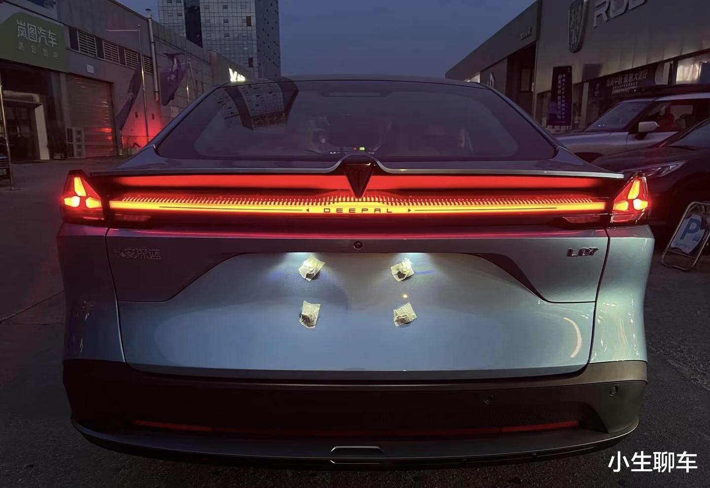 最后来看看外观,深蓝L07的外观设计动感时尚,兼具科技感与实用性,整体圆润可爱且时尚大气,配备电动尾翼和贯穿式LED尾灯,提升了车辆的辨识度和科技感,无框车门、全景天幕等,进一步增强了车辆的空气动力学性能和豪华感。