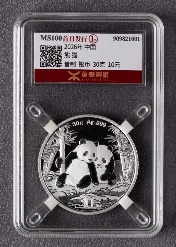 除了支架设计,这种封装盒还有很多其他优势。就笔者而言,是非常喜爱熊猫币的,因为熊猫币有一定范围的世界知名度,且发行至今已成最为著名的一个金银币系列。就用前几天拿到的2026熊猫币举个例子,标签上可以清晰看到印有“首日发行”的专属字样,代表了这枚币一经发行就送评,无论自藏还是送礼,纪念意义可谓直接拉满,满足了笔者的收藏情怀。更别说这枚银币本身两只熊猫造型生动可爱,栩栩如生。