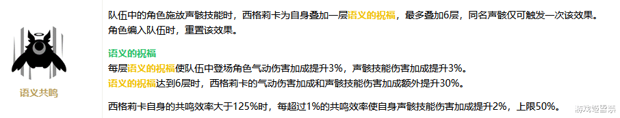 西格莉卡固定技能还有个自拐,队伍中有人释放声骸技能时当前角色获得一层“气动伤害加深3%”“声骸技能伤害加深3%”最高叠六层18%,叠到六层时给西格莉卡提供额外的气动声骸加成各30%,另外,西格莉卡的共鸣效率大于125%时每1%额外效率提升2%声骸技能伤害,最高50%也就是转化25%的共鸣效率提升。