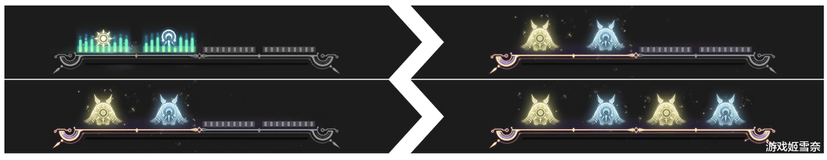 另外,获取能量时有蓝黄区分,效果是根据消耗的能量条颜色不同造成不同的特殊效果,在四次普攻后如果是按下高亮普攻得到的是黄色能量,两格黄色能量转化时有停滞效果定身敌人,对单使用,同样的,如果是按下高亮战技则得到的是蓝色能量,两格蓝色能量转化时有聚怪,适用于对群,若是一蓝一黄则无特殊效果单纯提升伤害。