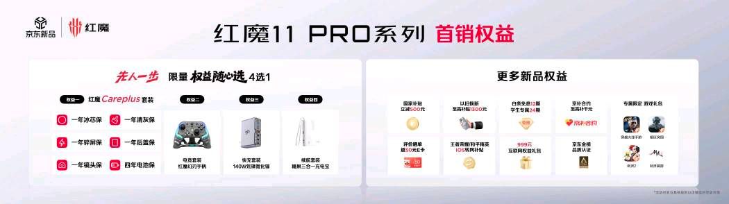10月17日,红魔11 Pro系列开启全球首发!在京东搜索红魔11 Pro,即可“先人一步”体验新机带来的全新电竞体验。不仅如此,同时还有红魔散热器、手柄、充电宝、氮化镓充电头等系列生态周边产品上新,多重惊喜权益礼包等你开启:首销用户下单即享专属福利:Careplus套装、红魔幻刃手柄、140W氘锋氮化镓快充套装、糖果三合一充电宝续航套装四选一,现在下单可享京东白条12期免息,学生更有专属24期免息福利,用户以旧换新至高可享1300元补贴。此外,购买红魔11 Pro系列的用户,还能解锁多重 游戏福利,可享《穿越火线:枪战王者》、《暗区突围》、《剑灵》、《剑灵2》等热门游戏专属限定礼包,带给用户专属游戏体验!