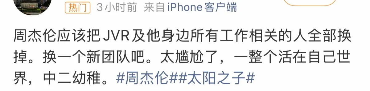 更有网友犀利喊话,建议周杰伦换掉身边的团队,吐槽他“彻底活在自己的世界里,太热血中二,与时代脱节”。