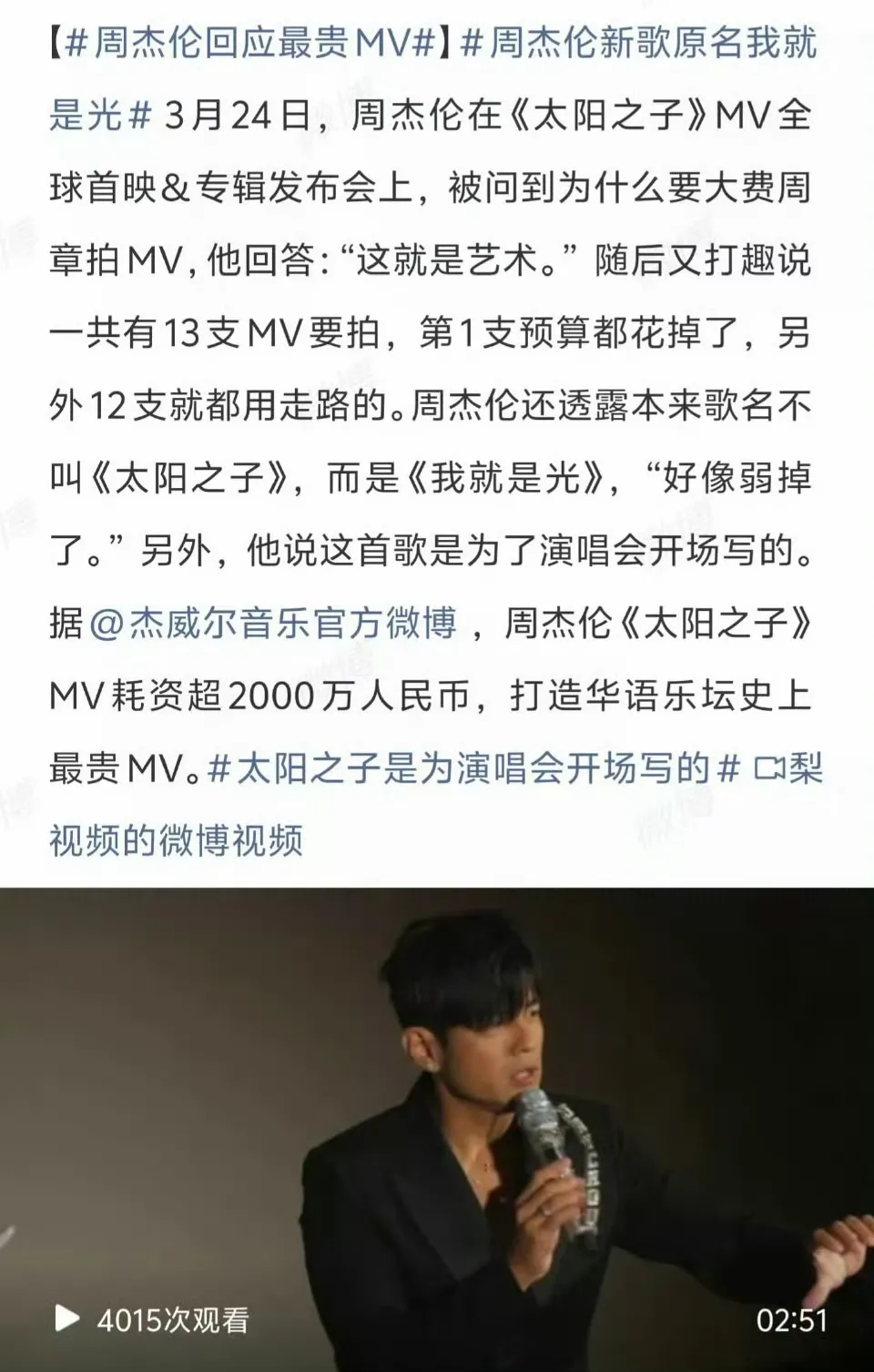 面对铺天盖地的质疑,周杰伦在发布会上坦然回应,透露这首歌原名其实是《我就是光》,初衷是传递正能量,而同名MV更是斥资2000万打造,耗时两年三个月,携手好莱坞顶级特效团队复刻了30幅世界名画,堪称华语MV制作的天花板。