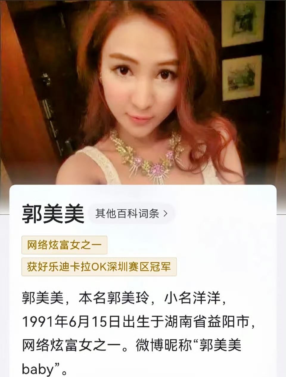 郭美美1991年出生于湖南益阳一个单亲家庭。其父有诈骗前科,其母长期经营洗浴、桑拿、茶艺等休闲服务。她自幼随母亲生活,2008年9月至2009年9月花钱进入北京电影学院表演系进修一年,毕业后成为“北漂”一族。2011年,郭美美因虚构“红十字会商业总经理”身份炫富爆红网络,引发公益信任危机。她曾在接受警方审讯时表示:“当时才19岁,就是有点害羞,不想承认男朋友比自己大那么多,所以才说是干爹,没想到越扯越扯不清楚了”。