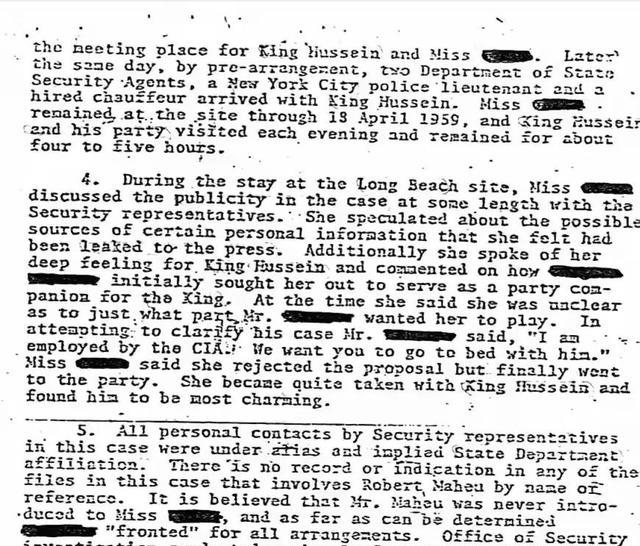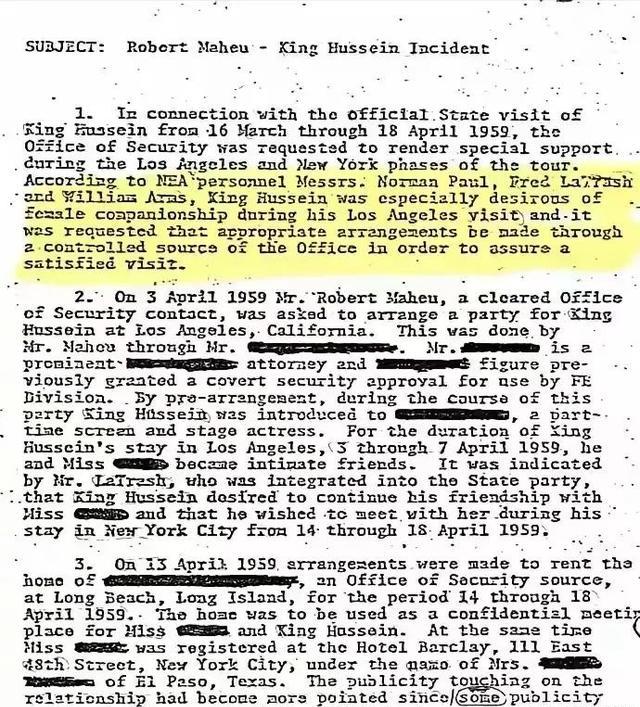肯尼迪档案解密后,又有细节被翻出来了。1959年3月16日至4月18日,约旦国王侯赛因对美国进行了正式国事访问。侯赛因访美期间觉得长夜漫漫无心睡眠,想找个美女来抚慰寂寞的心灵。美国安全办公室(Office of Security)接到命令,被要求提供特别支持,特别是在洛杉矶和纽约的行程中。美国近东事务局(NEA)人员诺曼·保罗(Norman Paul)、弗雷德·拉特拉什(Fred LaTrash)和 威廉·阿姆斯(William Arms)对此给出的说法是:侯赛因国王在洛杉矶期间特别渴望女性陪伴,并要求通过安全办公室的受控渠道进行适当安排,以确保此次访问的满意度。
