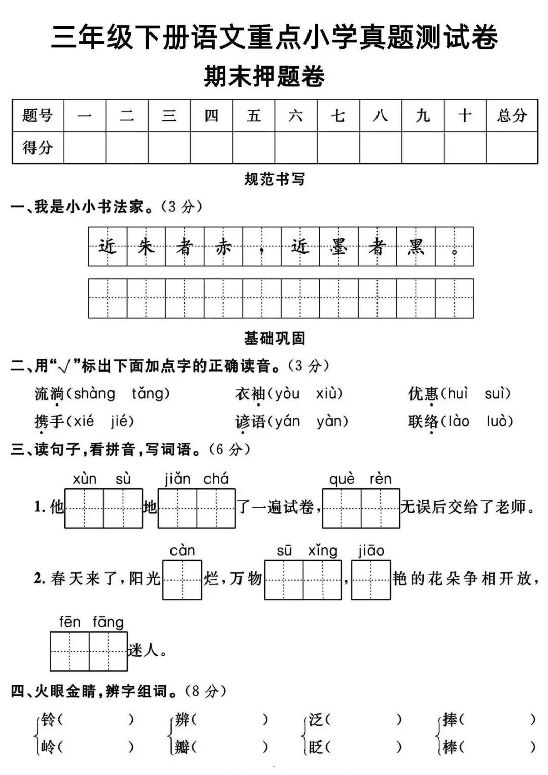 今天分享一份很好的三年级下册语文期末押题卷,都是重点小学的真题哦!
