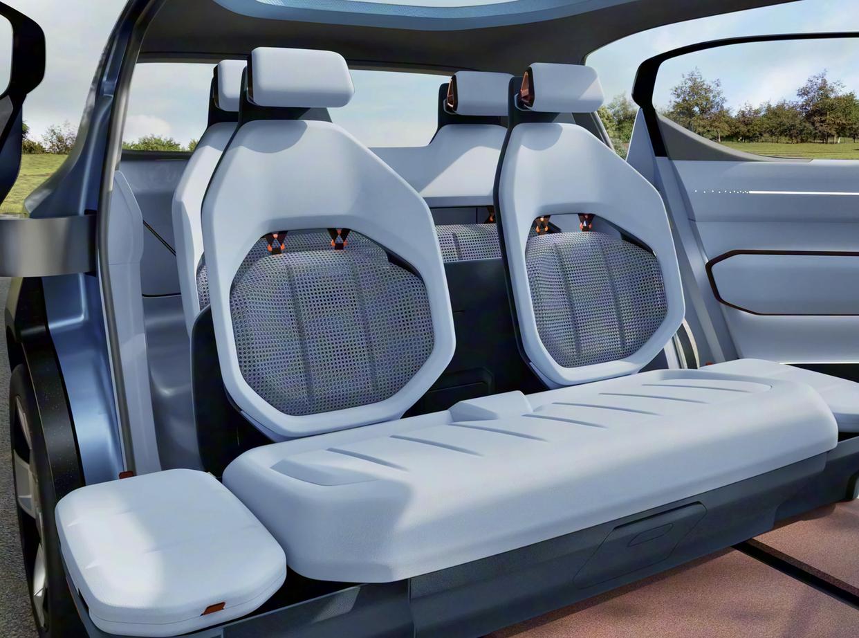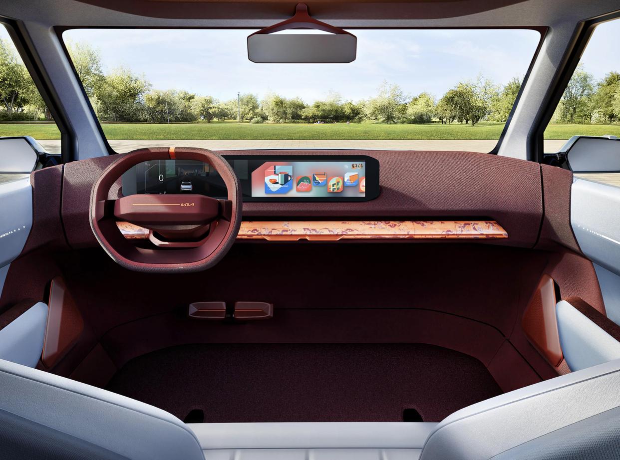 进入车内,起亚EV2采用了米白色软性材质的铺陈,悬浮式的中控台采用了朱砂红色的配色,并配备了银灰色的一体式3D打印座椅,且并无中央扶手等。后排座椅椅垫可以向上抬起,配合前排座椅超长的滑轨,展现了起亚工程师对车内空间的构思。座椅的头枕两侧还加入了扬声器,也能带来殿堂级的尊享感受。中控台配备了异型方向盘,方向盘中间加入了很多触摸感应式的按键,12点方向还配备了同色系的金属回正徽标。悬浮式的彩色液晶仪表与中控液晶屏融为一体,形成了带鱼屏设计,配合着下方大面积触摸感应面板,带来了最直观的视觉冲击力。