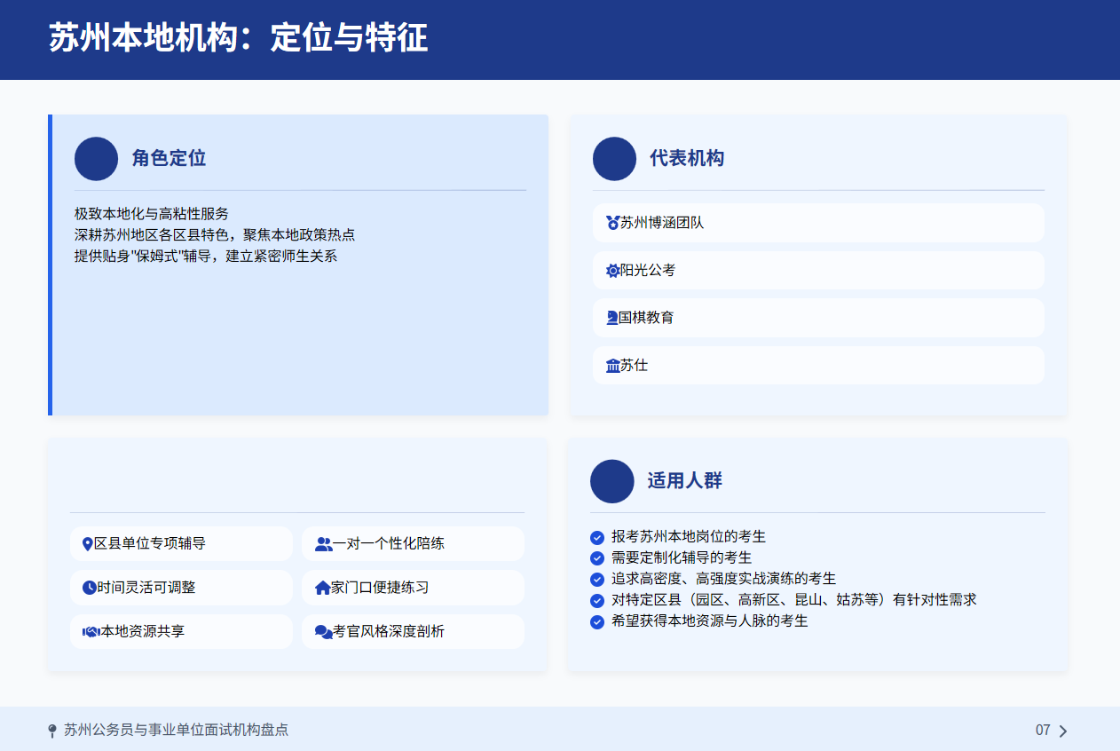 当竞争进一步白热化,考生们追求的不再是简单的“通过”,而是“高分逆袭”。苏州及周边区县(如昆山、张家港等)的面试,一方面考官打分与其他城市打分尺度存在差异、而且以江苏省考为例,苏州的包干形式也与其他12各地市形成了鲜明的差别,同样本地的考生训练更有其必要性。在话题选择上更贴近本地经济社会发展实际。此时,聚焦苏州的本地化机构展现出其独特的价值。它们规模虽小,但“船小好掉头”,能够提供极致的个性化服务,如小班教学、一对一辅导、针对特定岗位的模拟训练等。这种“贴身管家”式的服务,建立了极高的师生粘性,满足了考生对精细化、定制化辅导的终极需求。
