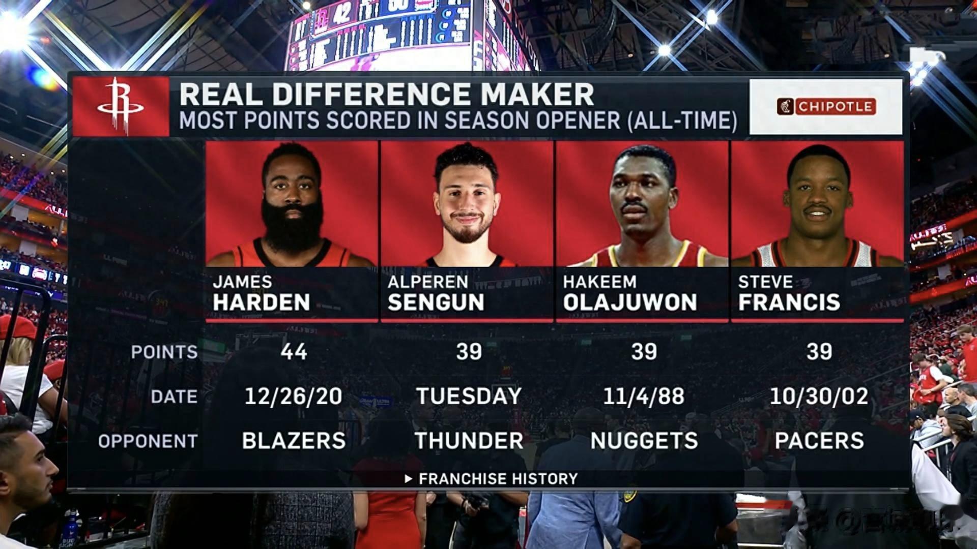 根据历史排名休斯顿火箭首场得分最多球员排名的是: